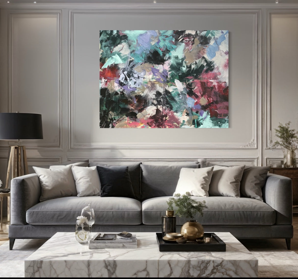 Maleriet er 116x89 cm og er malt med akryl på en smal blindramme (1,5 cm). Maleriet kan derfor henges direkte på veggen.