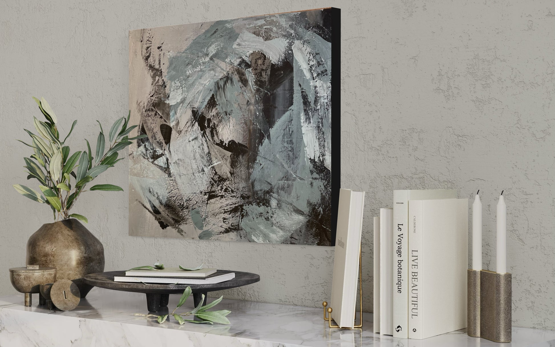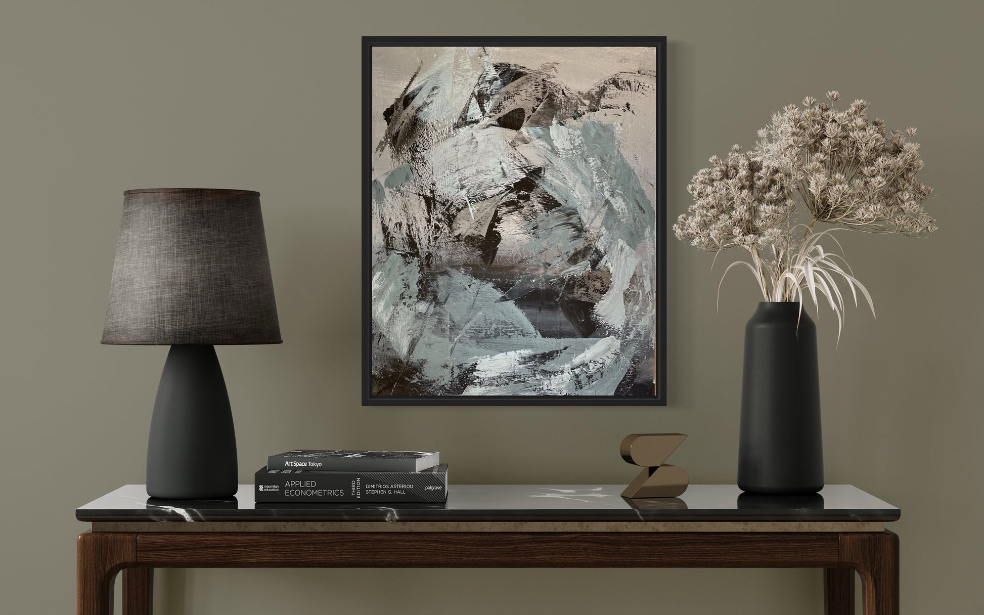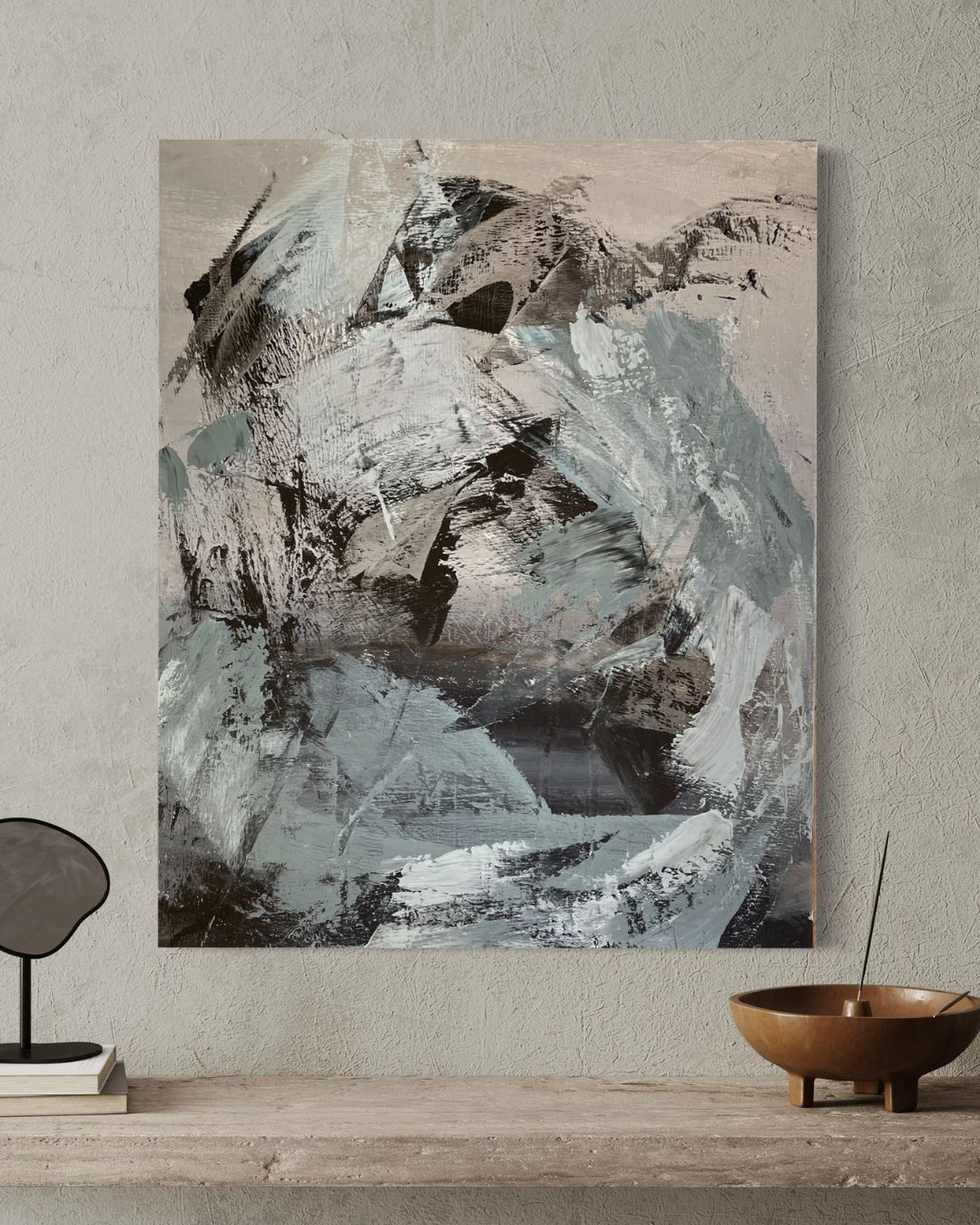 Maleriet er 40x50 cm og malt med akryl på en smal blindramme (1,5 cm). Maleriet kan derfor henges direkte på veggen. Kantene er malt sorte. Maleri i denne størrelsen vil også gjøre seg godt i ramme (se bildeeksempel). Dette må eventuelt gjøres av kjøper.